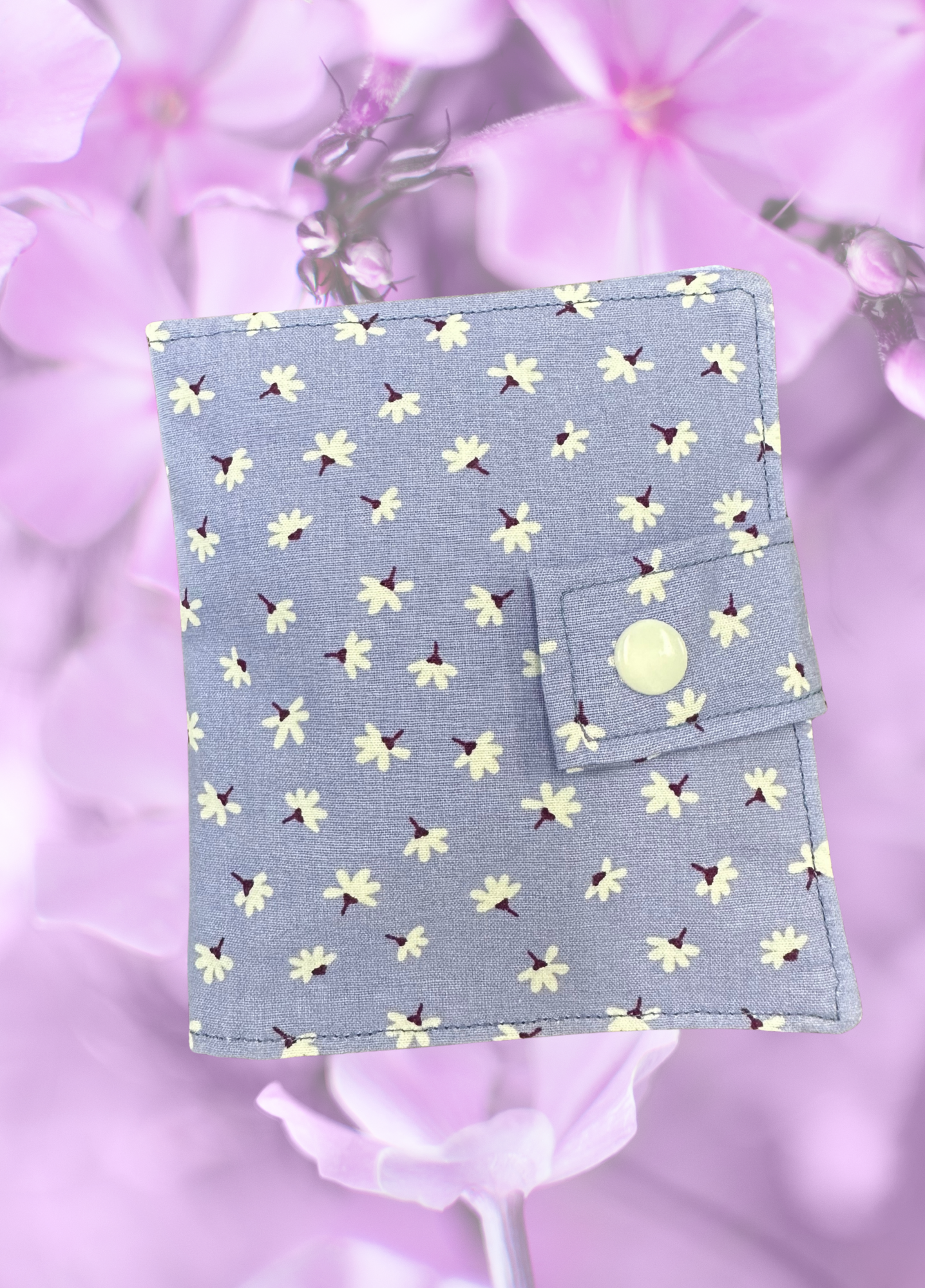 Il Porta Assorbenti Lillà con sfondo lilla e piccoli fiori bianchi delicati ed eleganti. Chiuso con un bottoncino a pressione bianco.