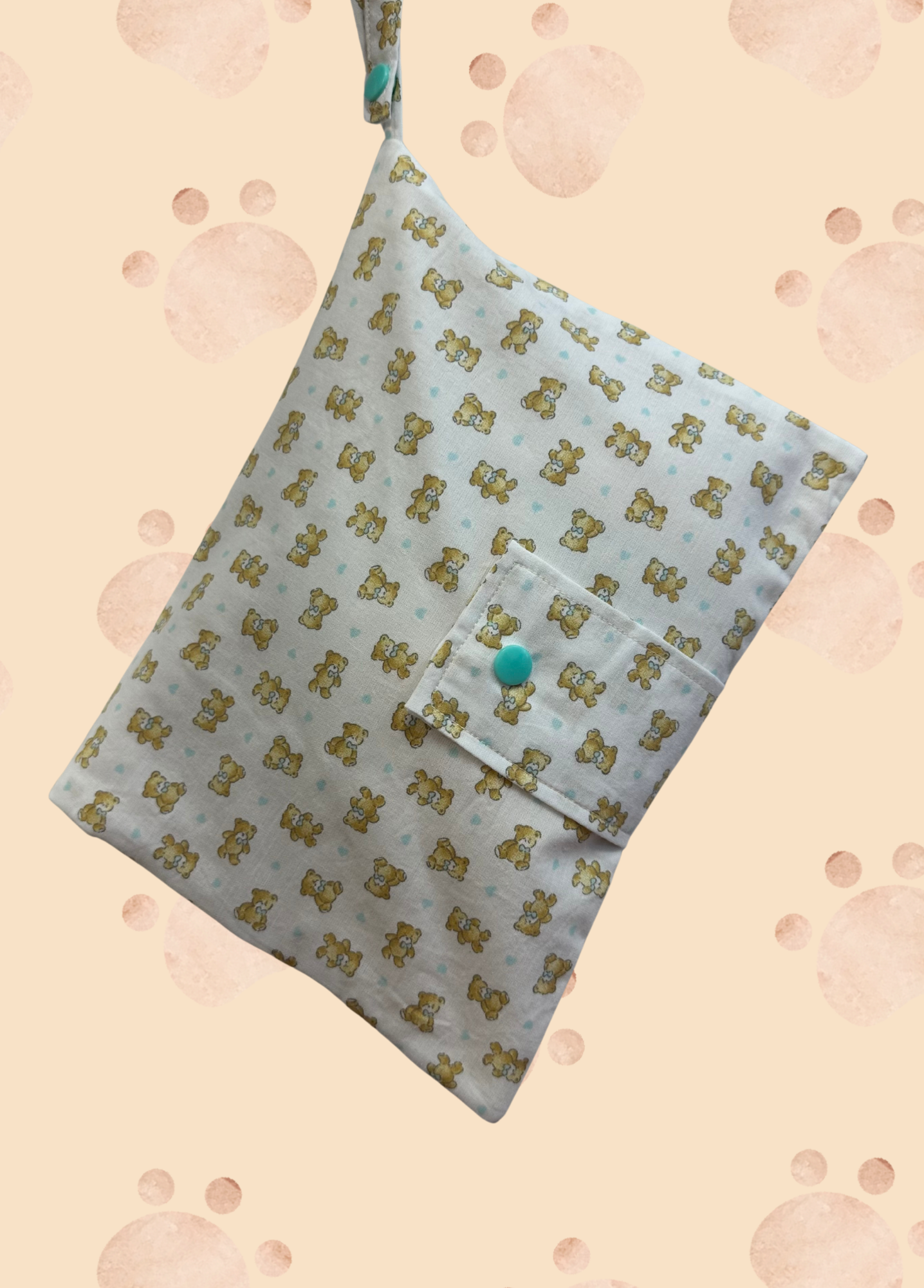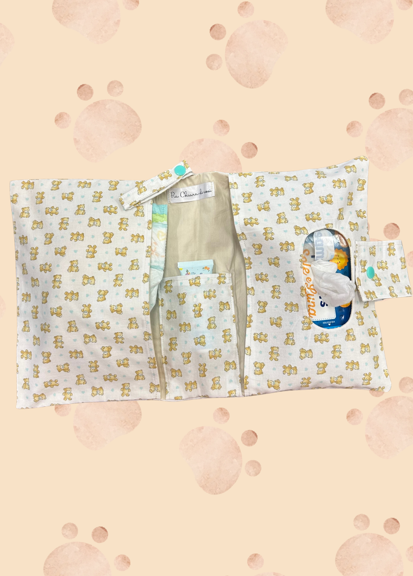 Il Porta Pannolini orsacchiotti con sfondo panna e dolci orsacchiotti che popolano la scena. Chiuso con un bottoncino a pressione celeste.