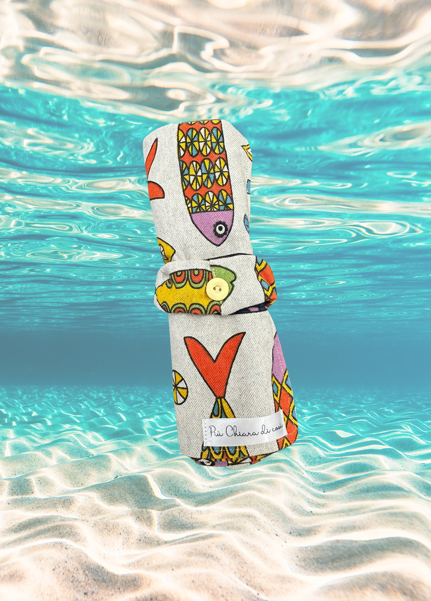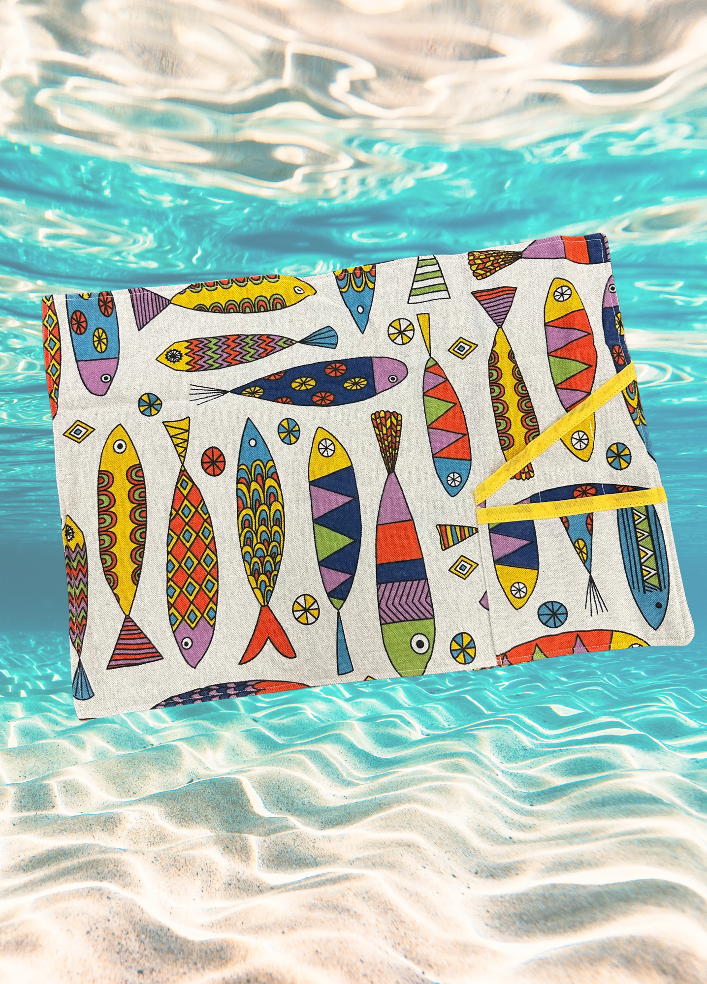 In stoffa Marine con sfondo avorio e grandi pesci colorati che popolano la scena. da portare comodamente in borsa.