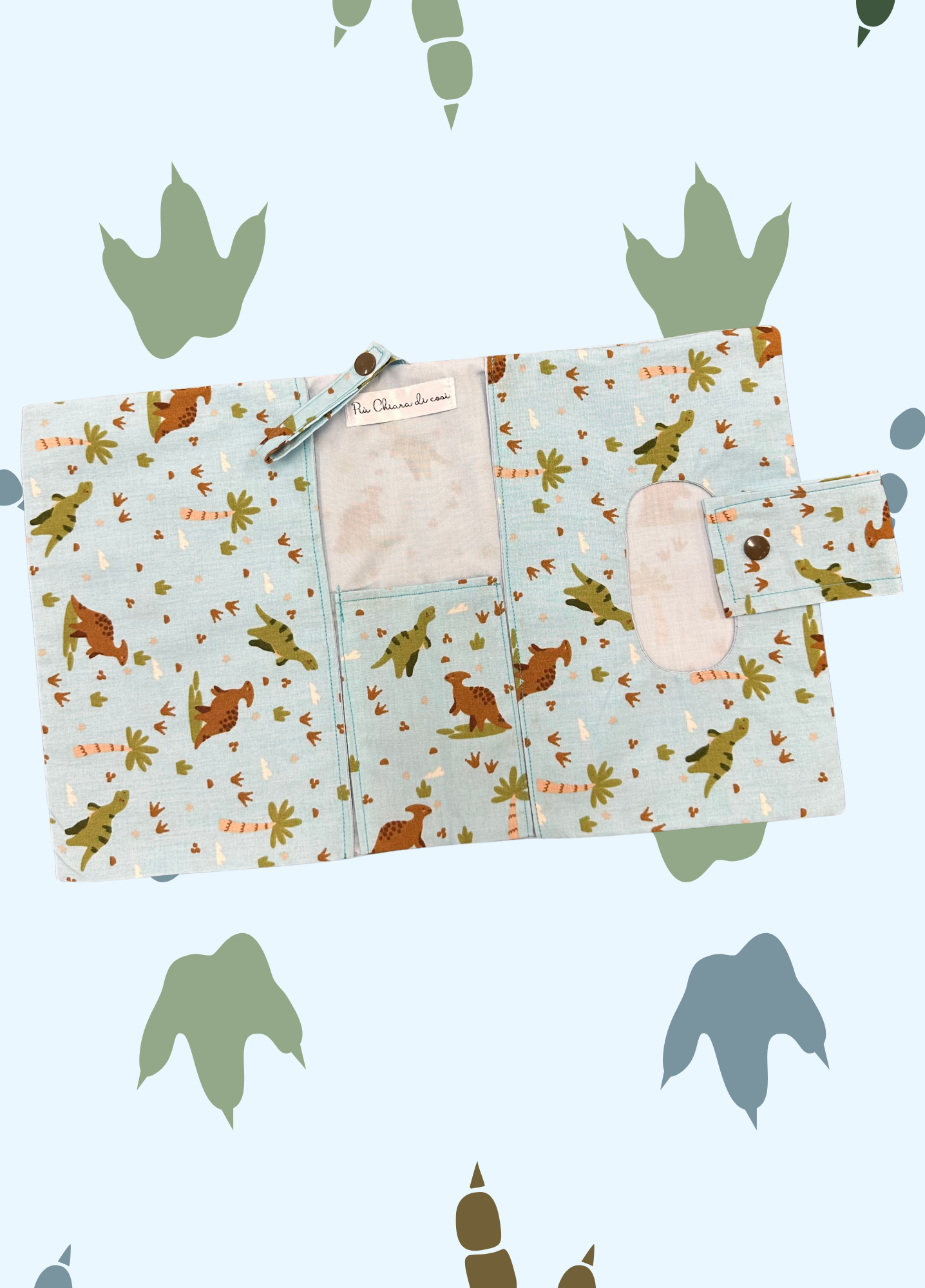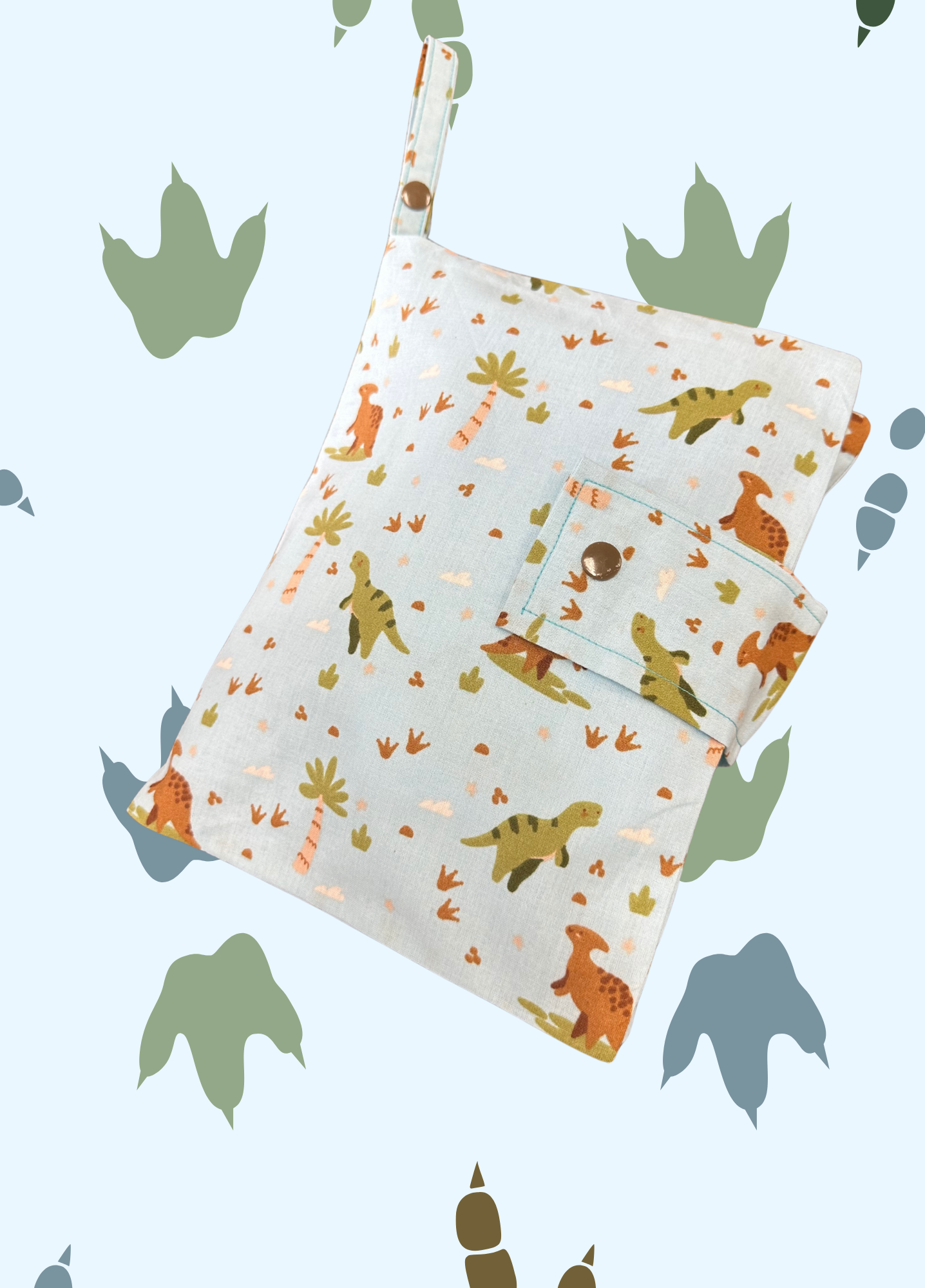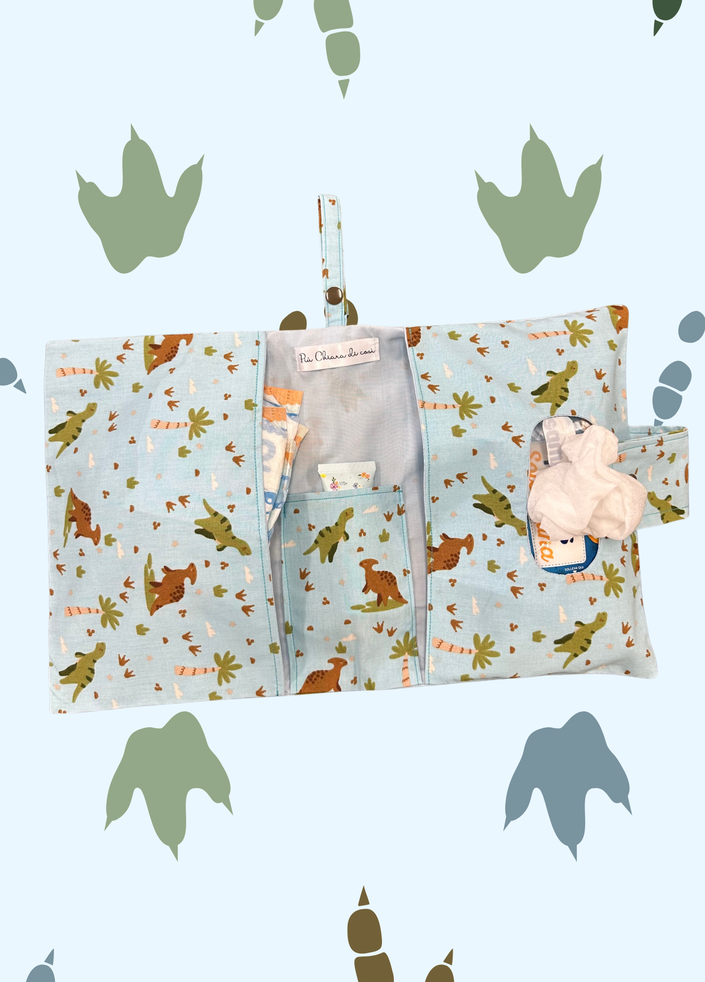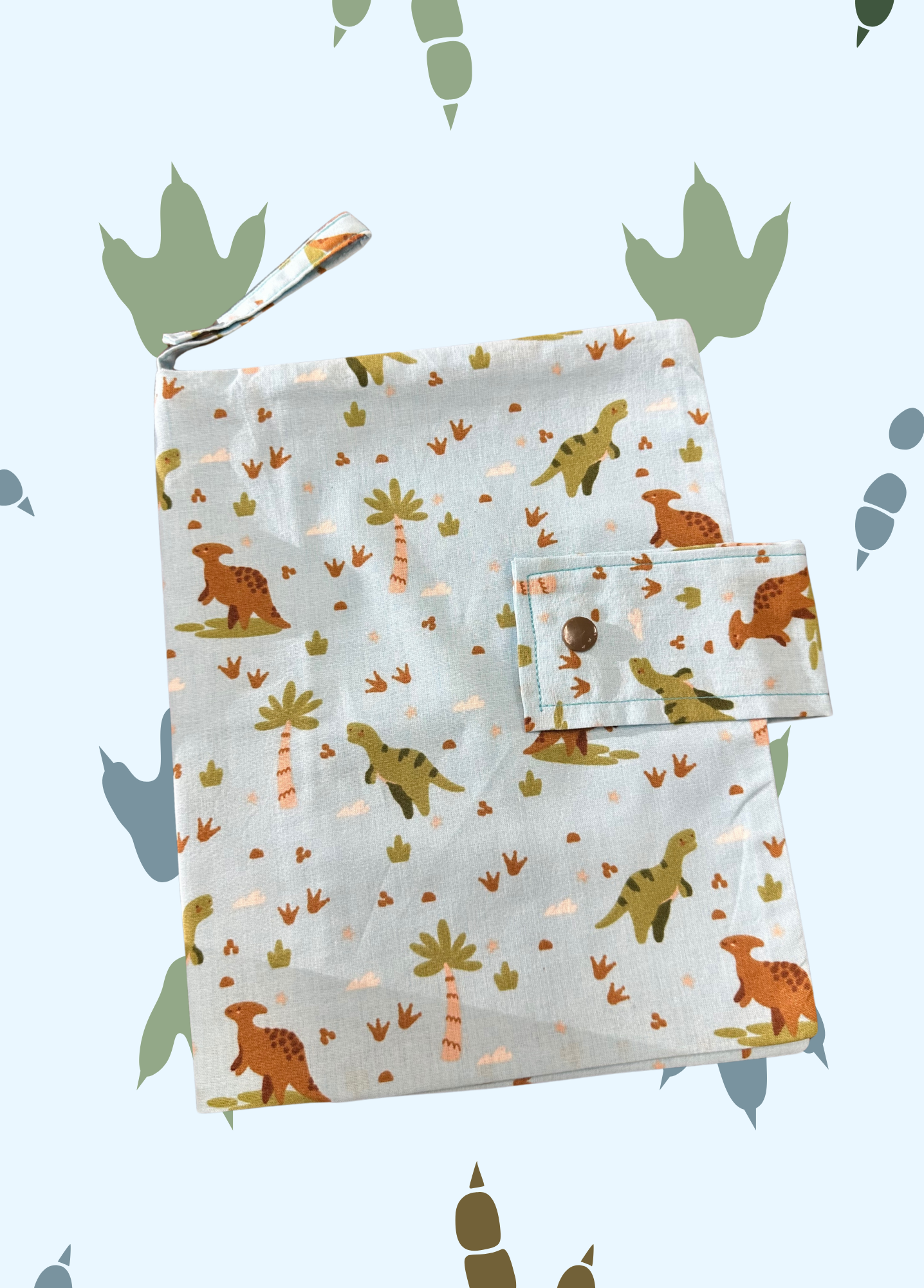 Il Porta Pannolini Dino 2.0 con sfondo celeste pallido e dolci dinosauri che popolano la scena. Chiuso con un bottoncino a pressione marrone.