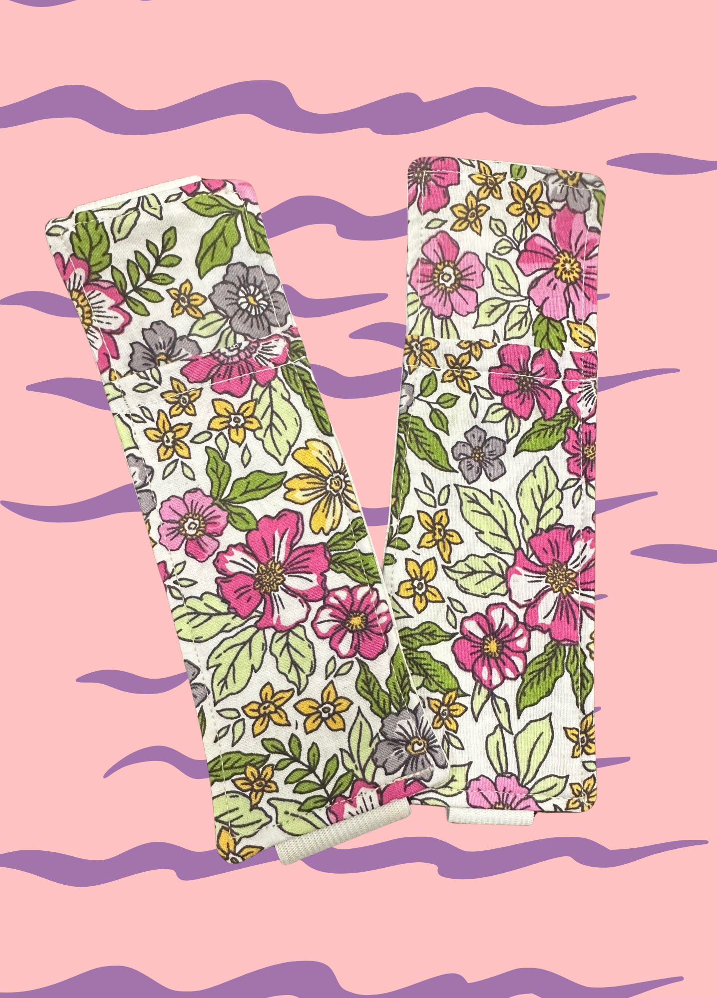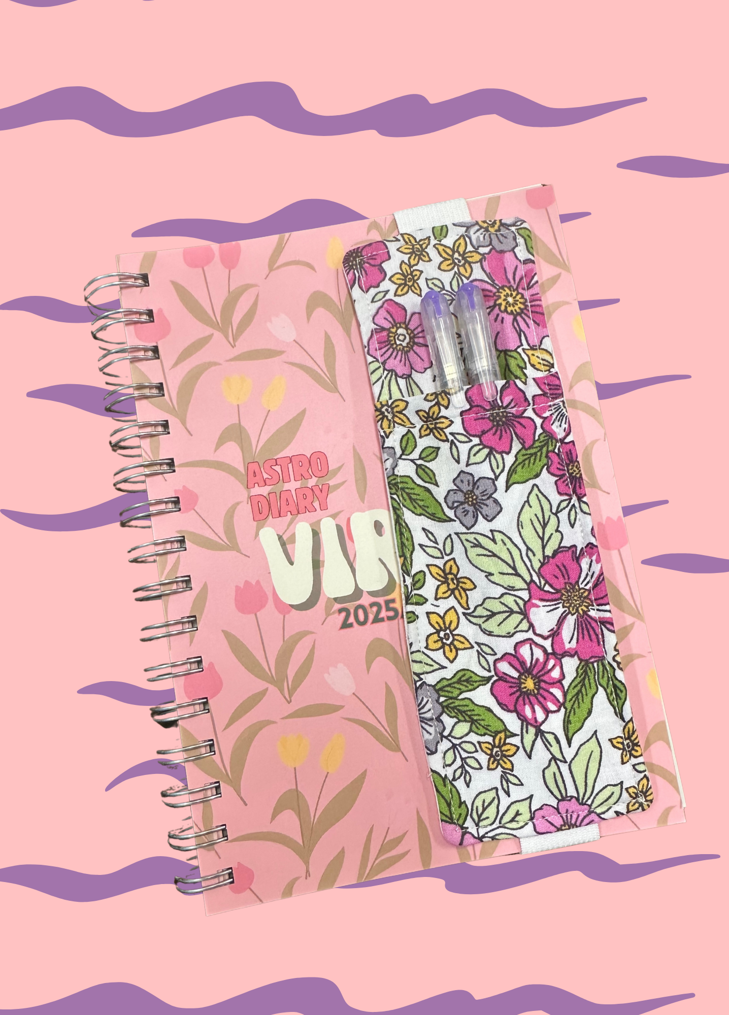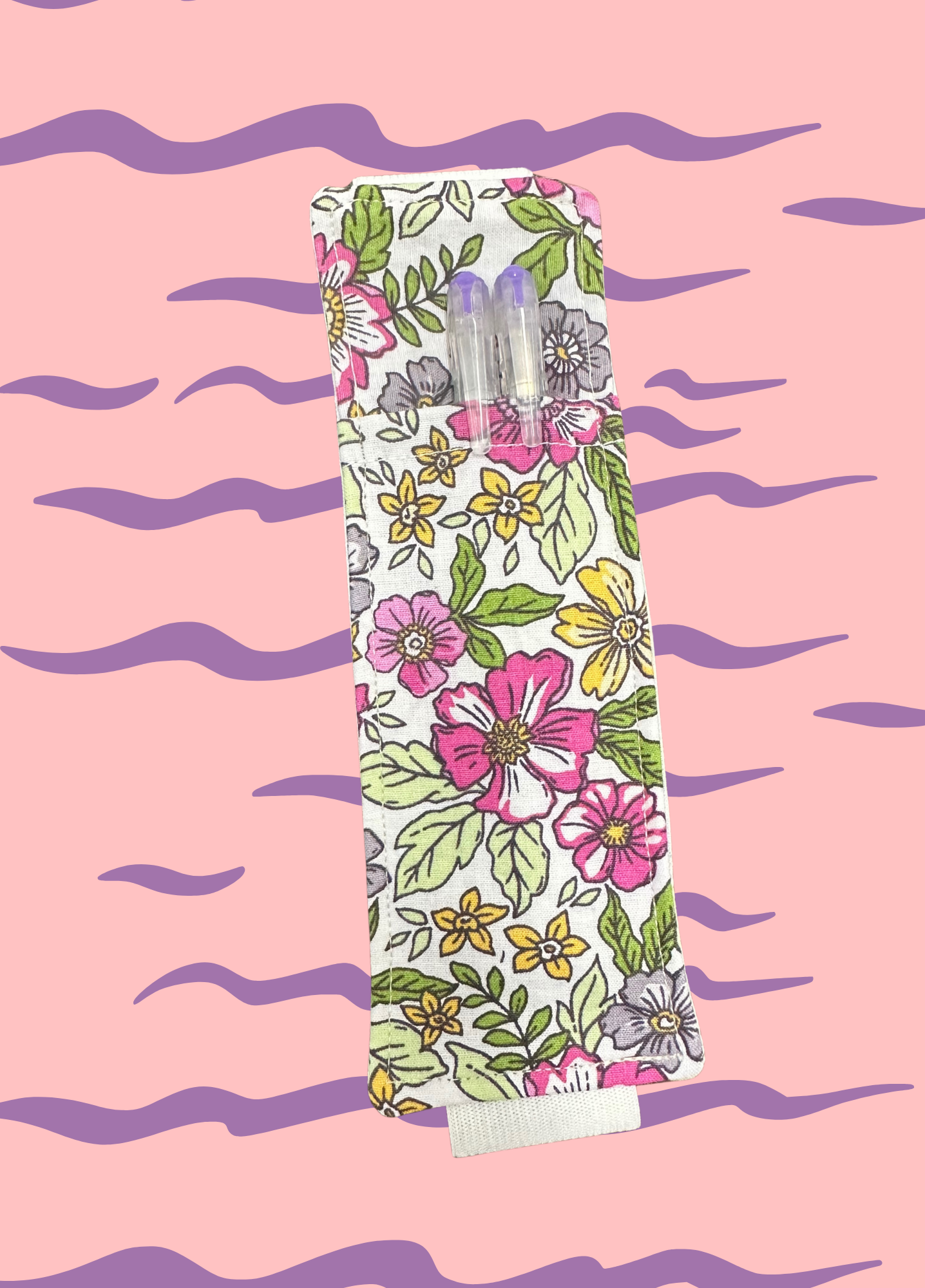 Porta penne in stoffa Rosy con elastico bianco, comodo da applicare su libri, agende, quaderni, planner per avere sempre a portata di mano penne, matite, evidenziatori, segna pagina ma anche occhiali da vista.