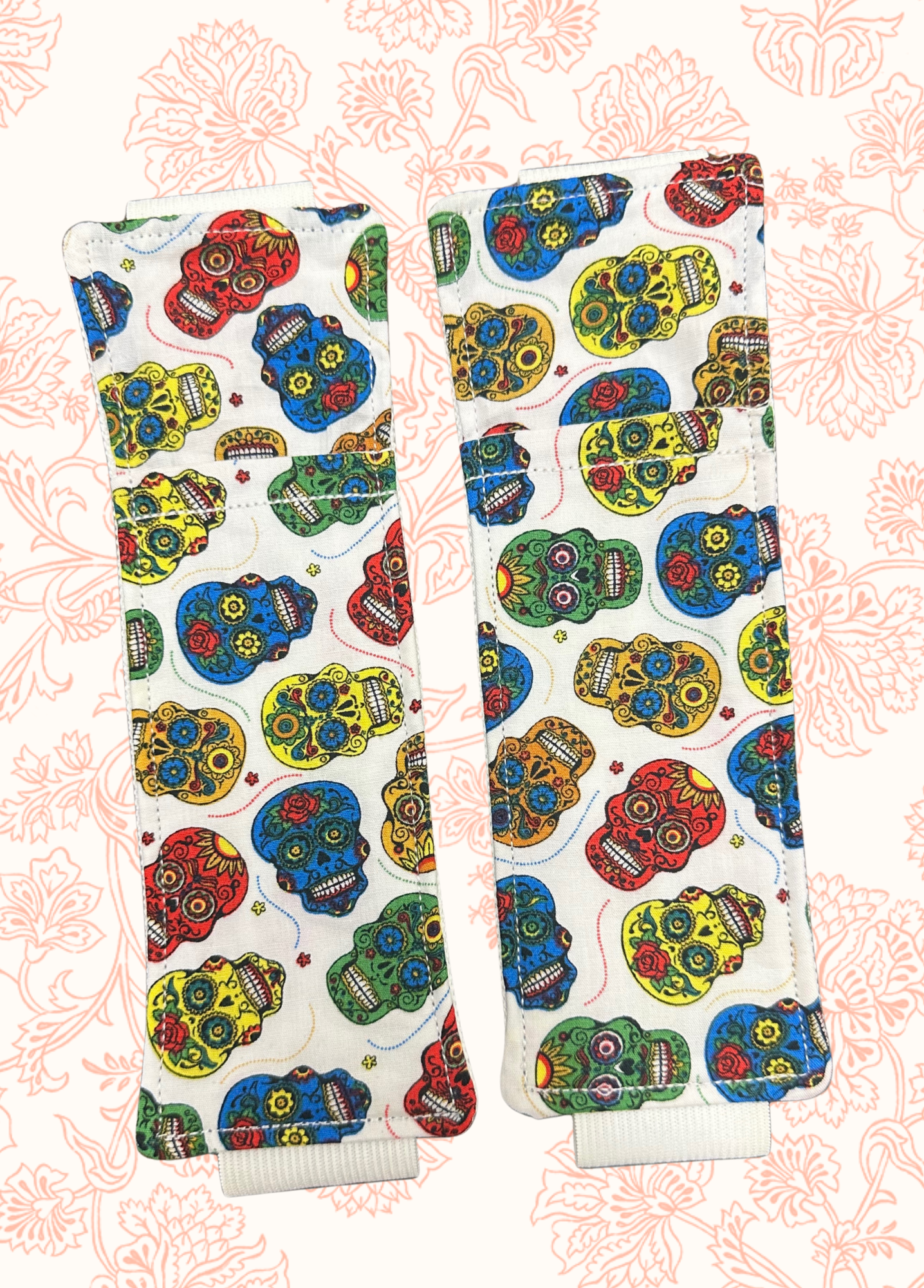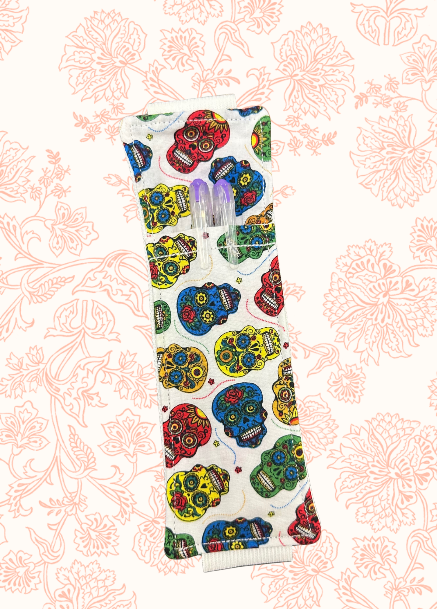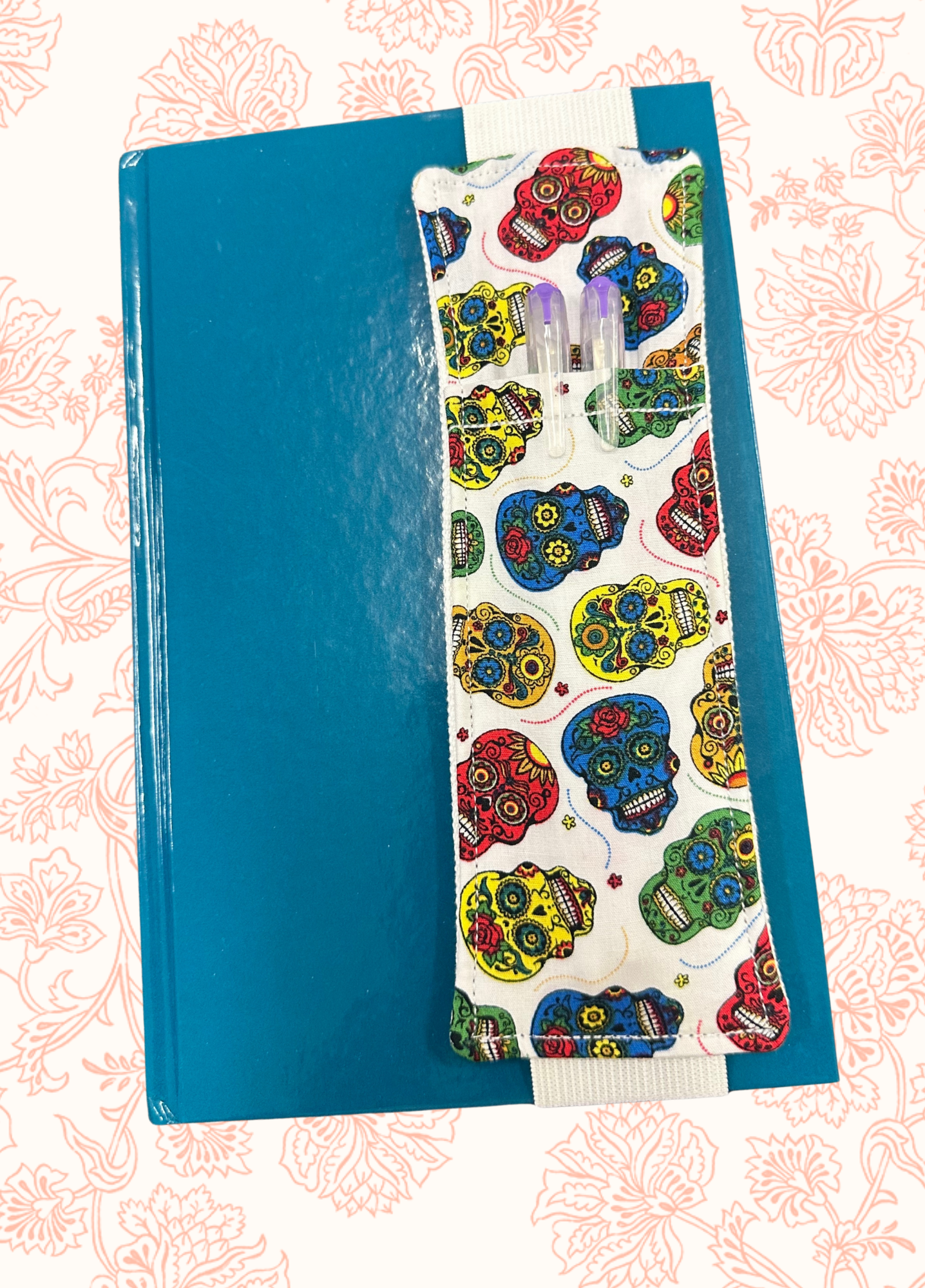 Porta penne in stoffa Skull con elastico bianco, comodo da applicare su libri, agende, quaderni, planner per avere sempre a portata di mano penne, matite, evidenziatori, segna pagina ma anche occhiali da vista.