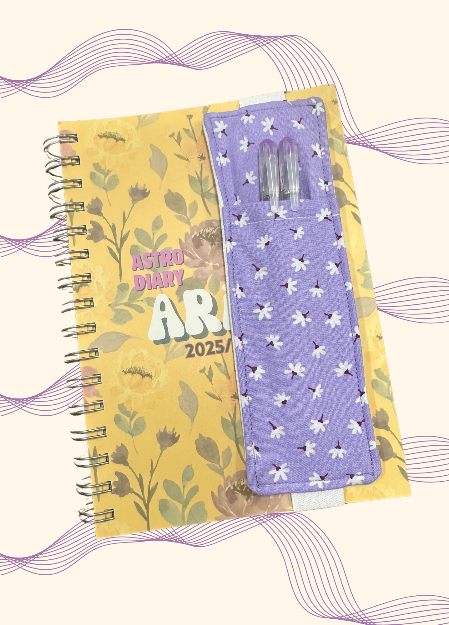 Porta penne in stoffa Lillà con elastico bianco, comodo da applicare su libri, agende, quaderni, planner per avere sempre a portata di mano penne, matite, evidenziatori, segna pagina ma anche occhiali da vista.