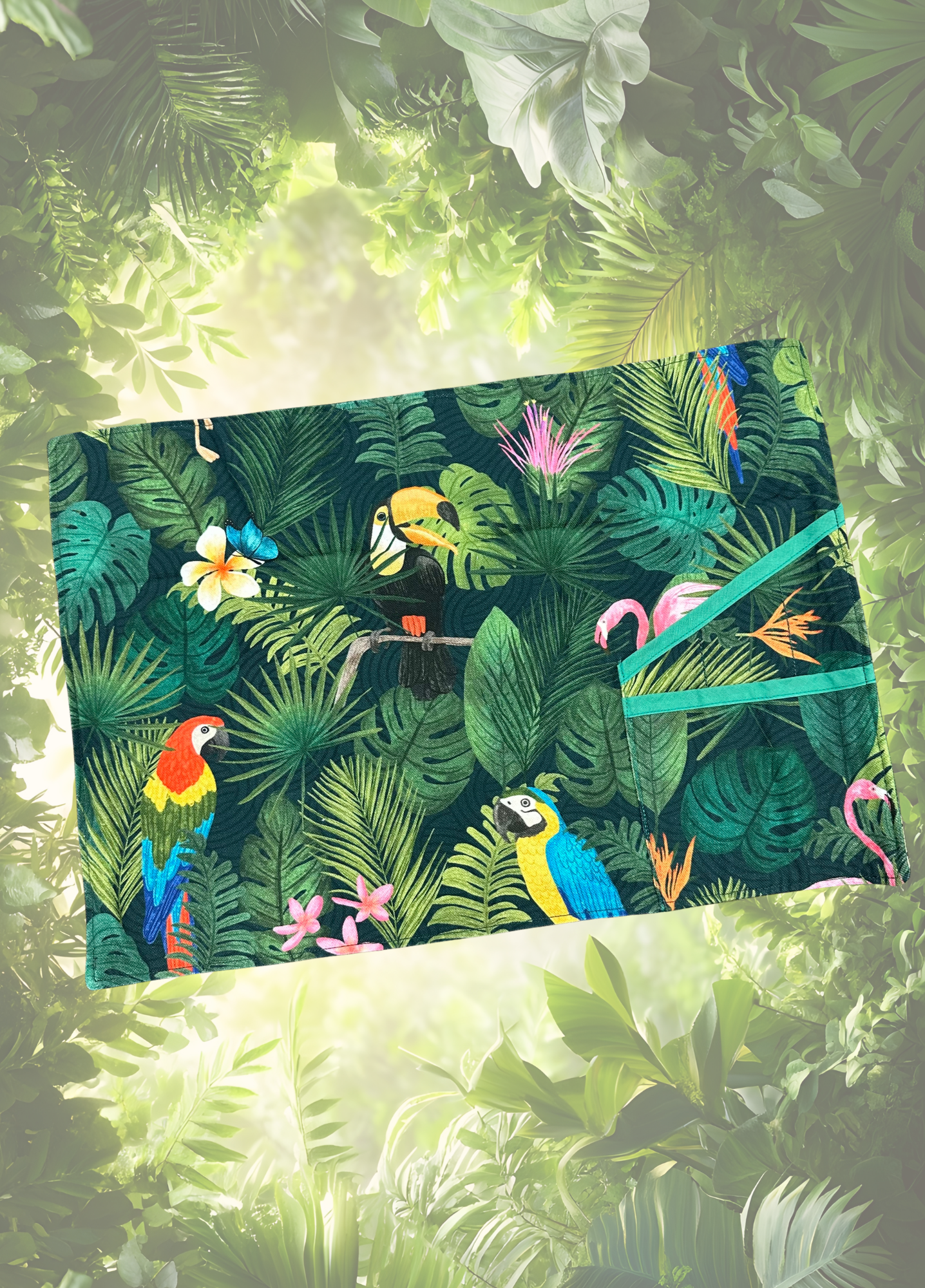 In stoffa jungle con sfondo verde scuro e foglie in diverse tonalità di verde con pappagalli colorati che popolano la scena. da portare comodamente in borsa.